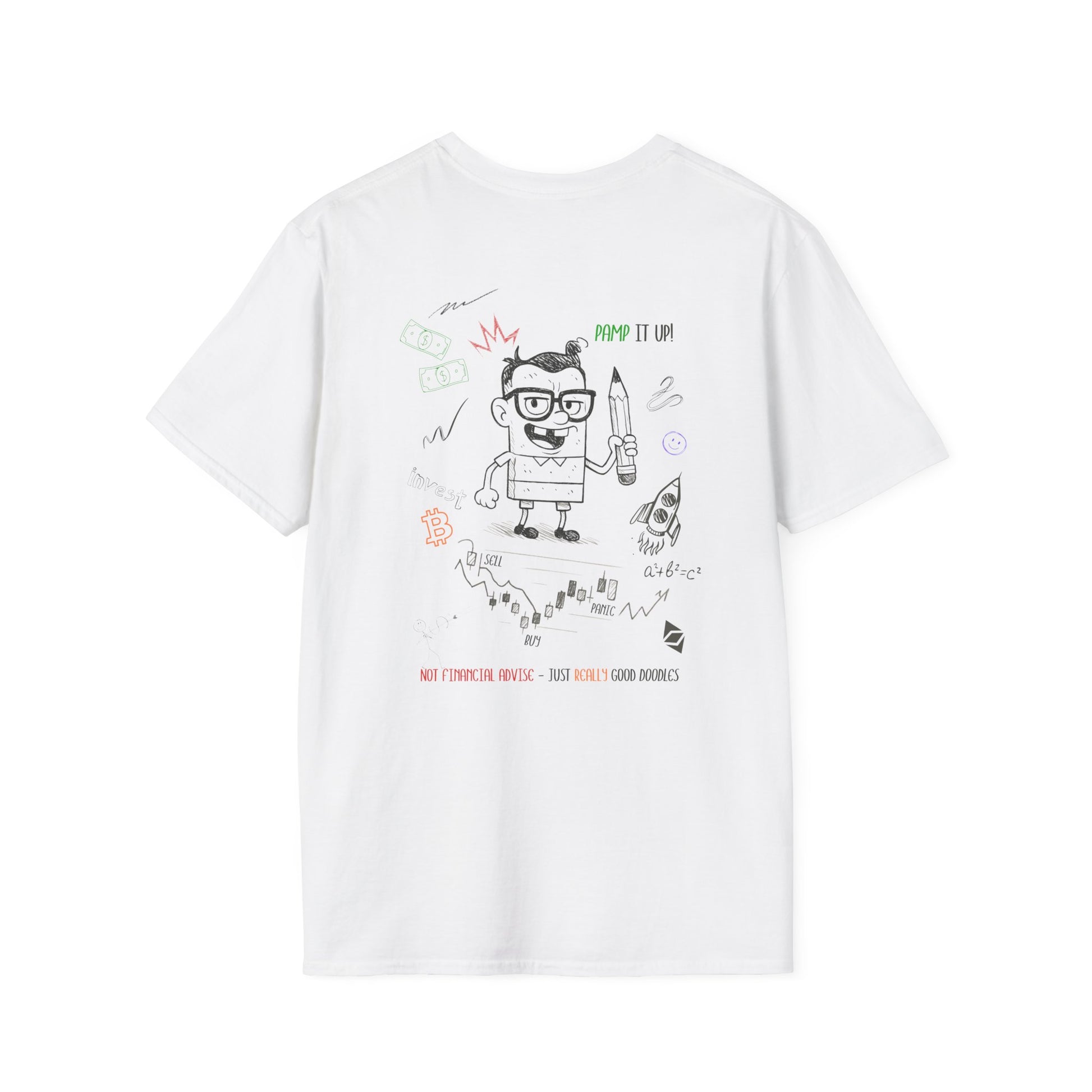A soft, breathable tee that feels lived-in from the first wear. This lightweight cotton shirt carries a hand-drawn, whimsical back illustration—an earnest, slightly nerdy character clutching a giant pencil, surrounded by doodles and tiny rockets—paired with a small, understated chest text. It wears like a favorite classroom sketch: relaxed, familiar, and quietly playful. The tubular knit and shoulder taping keep the silhouette tidy after many washes, while the ribbed collar holds its shape. Wear it while sketching, teaching, or wandering a local art fair; it sits comfortably under a jacket or on its own, bringing a casual, creative note to everyday moments.