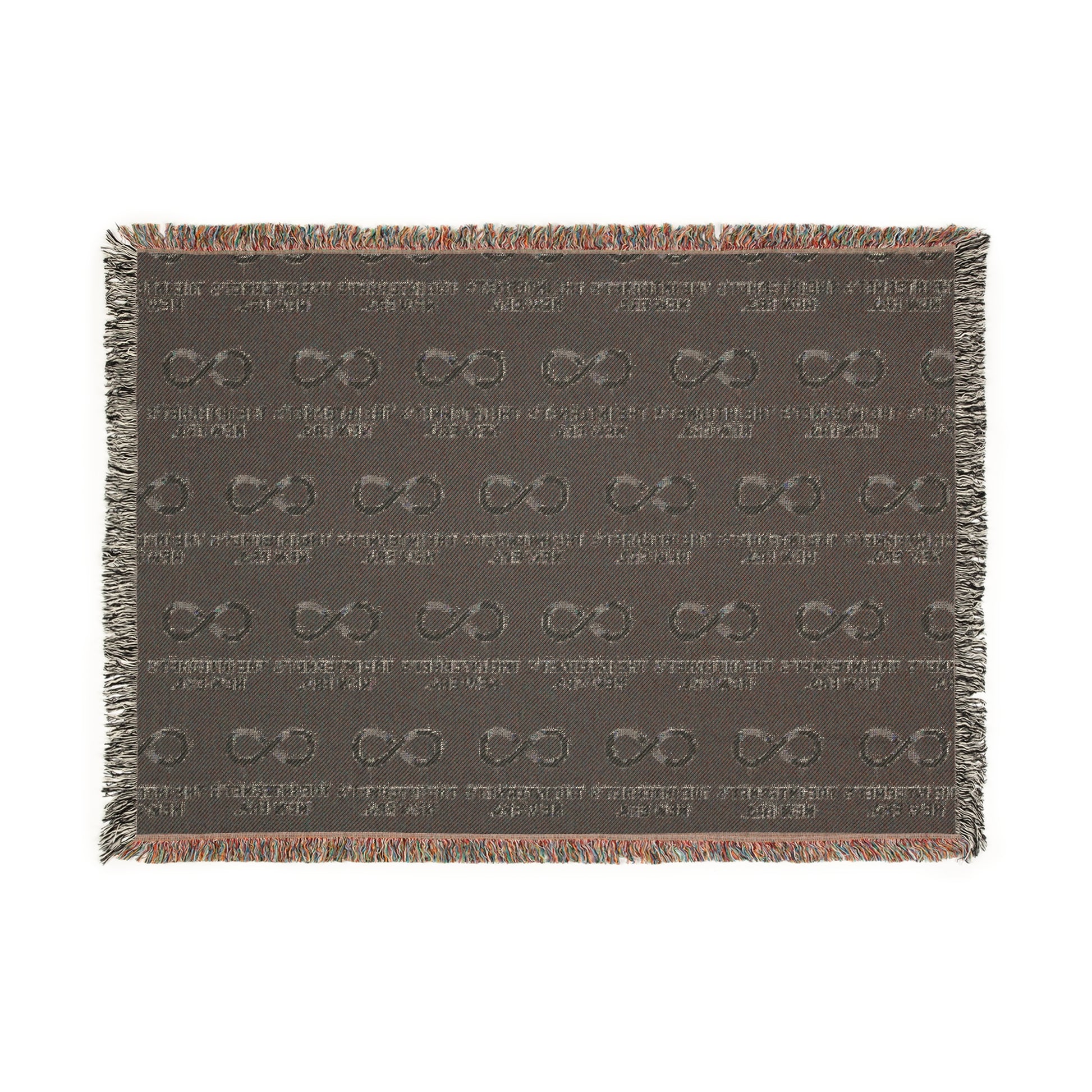This woven cotton blanket feels like a quiet companion for late-night reading and slow mornings. The subtle repeated motif—rows of linked infinity symbols and faint text—creates a rhythmic texture that looks handcrafted from a distance and reveals detail up close. Soft woven threads and colorful fringed edges add warmth and a lived-in charm. Choose the Photo variant to preserve tonal gradations and soft blurs, or the Artwork variant to make sharper, graphic elements pop. Lightweight but substantial, it layers easily over a sofa or at the foot of a bed and settles into everyday life without shouting for attention.