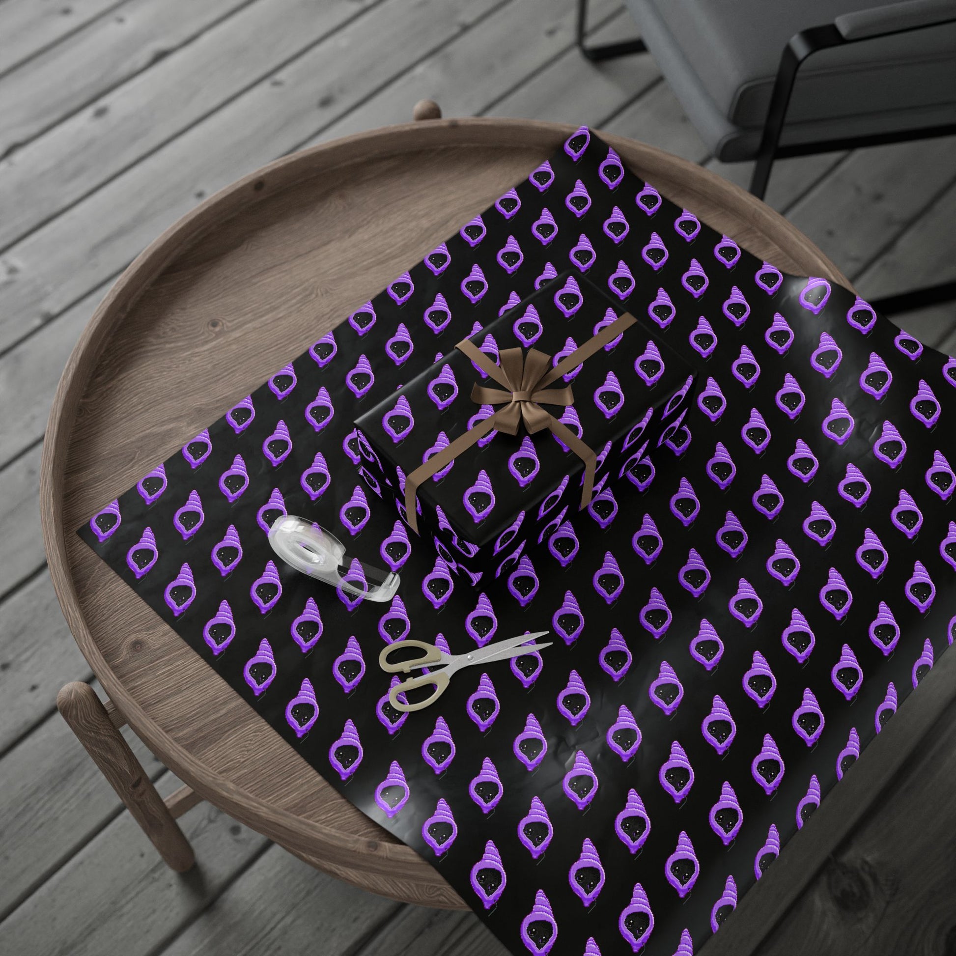Deep black paper peppered with a repeating hand-painted motif in electric purple — this wrapping paper brings playful goth energy to every gift. The small, teardrop-like shapes have a slightly rough, brushy edge that reads handmade up close and graphic from a distance. Use the smaller sheets to wrap jewelry boxes or tuck them into card envelopes; the long roll makes bold, continuous wraps for larger packages or table runners. The contrast of vivid purple against true black creates a dramatic, modern look that fits evening celebrations, themed parties, or anyone who loves moody, artful details.